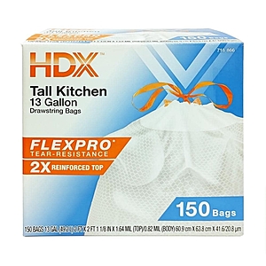 Buy 150 13-gallon trash bags with drawstring and 'flex' technology for $9.97 at Home Depot.