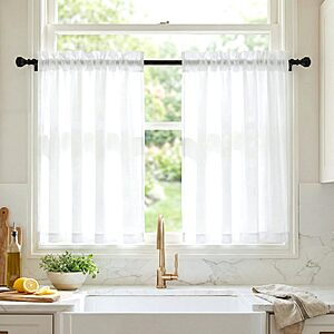 Thumb Score: +6 NICETOWN via Amazon [ amazon.com ] has 2-Panels 26″ x 30″ NICETOWN Privacy Sheer Cafe Curtains (Pure White) on sale for $16.95 – $5.09 (30%) off when you apply promo code 9TCHW4GC = $11.86 . Shipping is free w/ Prime or on $35+. Product Description from Amazon:[list][*]Size & Content: Includes 2 panels Non-See-Through curtians, 26″W x 30″L each. Top features a 3in rod pocket with a 2in header, compatible with most standard curtain rods. Fits regular home windows, offering basic privacy and a soft, decorative look.