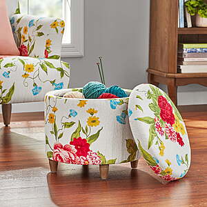 The Pioneer Woman Sweet Rose Round Storage Ottoman with Wood Tray Lid is a functional and stylish addition to any home. Featuring a round design with a storage compartment and a detachable wood tray lid, it’s perfect for storing items while also serving as a footrest or side table.