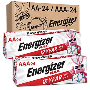 The Energizer AA and AAA Battery Combo Pack includes 24 Max Double A and 24 Max Triple A batteries, with a total of 48 count.