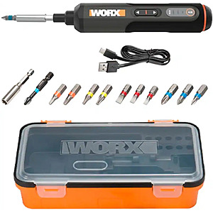 The WORX compact screwdriver kit features a rechargeable 4V battery with three speeds, 12 accessory bits, dual LED lights, and a 3-gear torque setting.