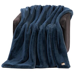 The UGG Euphoria Faux Fur Throw Blanket offers soft warmth and luxurious comfort, ideal for lounging on the couch or bed. It measures 50-inch x 70-inch and comes in Indigo Blue.
