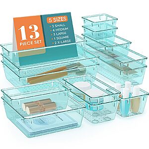 This WOWBOX 13-Piece Plastic Drawer Organizer Set comes in a attractive sea blue color and is currently on sale on Amazon.
