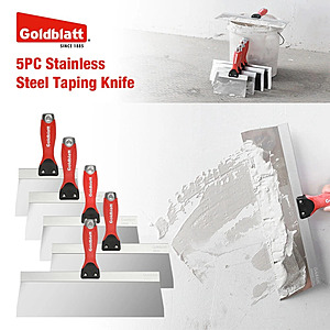 This Goldblatt 5PC Stainless Steel Taping Knife Scraper Tool Set includes 6” 8”10”12” 14” tools, perfect for a variety of tape applications. With its durable stainless steel construction, it ensures long-lasting use.