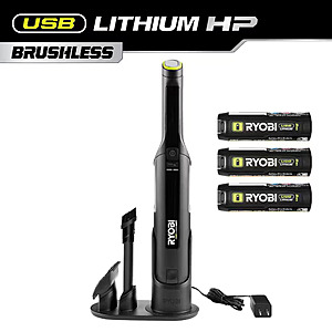 The Ryobi USB Lithium HP Compact Hand Vacuum Kit includes a high-performance hand vacuum cleaner, (3) USB Lithium 2.0 Ah rechargeable batteries, and charger. This kit is powered by the versatile RYOBI USB Lithium Battery.